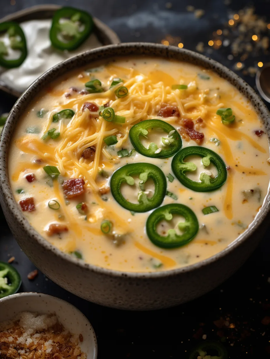 8. Garnish: Serve hot, garnished with crispy bacon, sliced jalapenos, and fresh cilantro if desired.